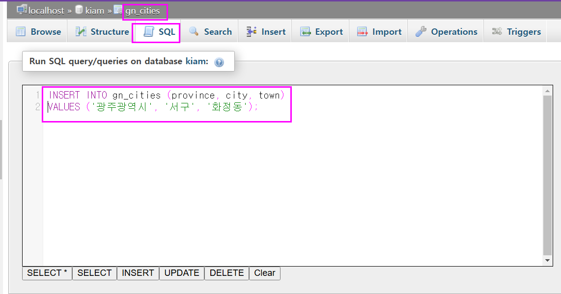 [ 디비테이블] 디버 지역 드롭박스에 지역명을 추가할 떼
